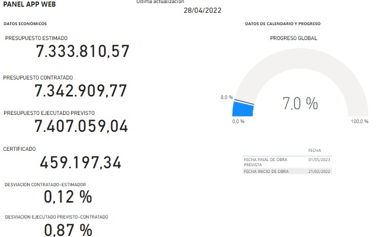 Monitorización de los avances de la obra basado en la captura masiva de datos de forma periódica, ofreciendo así en casi tiempo real (baja latencia) informes altamente precisos del estado de la obra a nivel económico y de calendario.